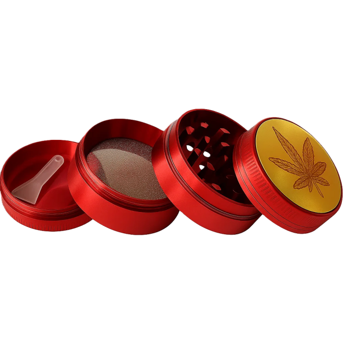 Гріндер "Cannabis" у червоному кольорі — це зручний та практичний аксесуар для якісного подрібнення тютюну. Завдяки компактним розмірам і міцній металевій конструкції він стане надійним інструментом для щоденного використання. Верхня кришка прикрашена золотистим тисненням у вигляді листка, що надає гріндеру оригінального й стильного вигляду.