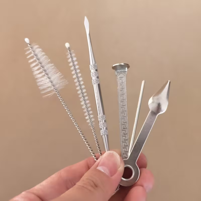 У комплект входять різні інструменти для комплексного очищення: щітки різного діаметру, скребок і допоміжні елементи для видалення нальоту. Завдяки цьому можна легко дістатися до важкодоступних місць і підтримувати аксесуари в чистому стані. Набір підходить як для домашнього використання, так і для щоденного догляду.