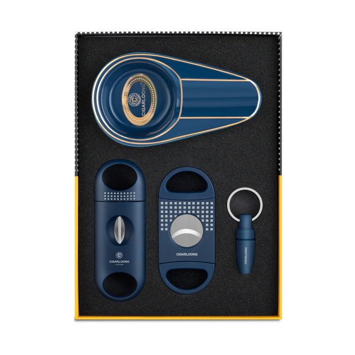 Елегантний подарунковий набір Cigarloong об'єднує чотири необхідні аксесуари для куріння сигар: класичну попільничку, дирокол і дві гільйотини різного розміру. Усі елементи виконані у фірмовому дизайні бренду Cigarloong, що поєднує практичність, стиль та зручність у використанні.
