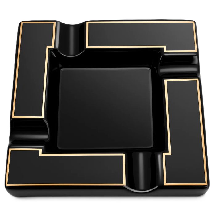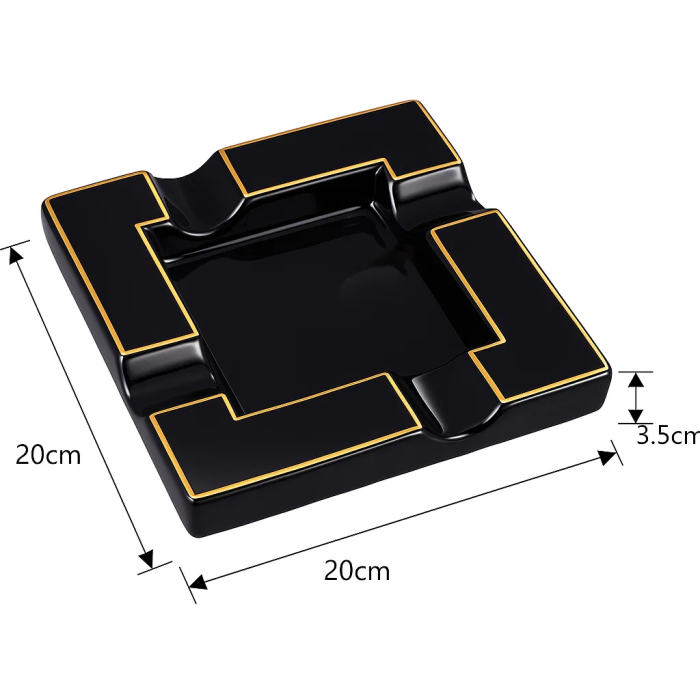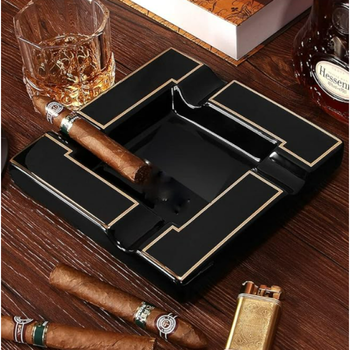 Попільничка для сигари квадратна, велика (Чорна) – стильний аксесуар, створений для тих, хто цінує комфорт та естетику під час куріння. Виготовлена з міцної кераміки, вона поєднує практичність і елегантний дизайн. Чотири зручні виїмки дозволяють розмістити одразу кілька сигар, що робить її ідеальним вибором для компанії або лаунж-зони. Чорний корпус із золотистими вставками надає виробу сучасного та розкішного вигляду, а глянцеве покриття підкреслює витонченість форм.