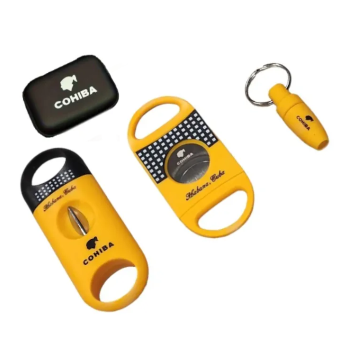 Опис Набір для сигар Cohibo 3 в 1 у кейсі (дирокол, 2 гільйотини) жовтий