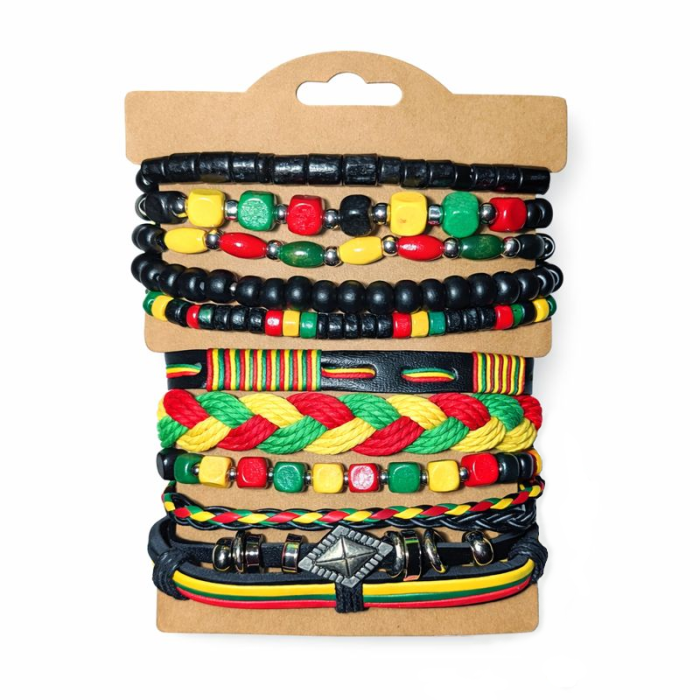 Оригинальный набор браслетов (10 шт) — стильный аксессуар с ярким этническим дизайном. Браслеты выполнены из сочетания шнуров, плетёных элементов и декоративных вставок, создающих выразительный образ с символикой свободы, единства и любви.