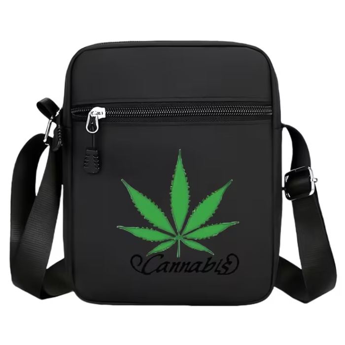 Сумка «Canabis» в чёрном цвете — это практичная и стильная кроссбоди-сумка для повседневного использования. Модель выполнена в лаконичном оксфордском дизайне и украшена зелёным принтом с листьями каннабиса и текстовыми элементами, создающими выразительный и современный образ.