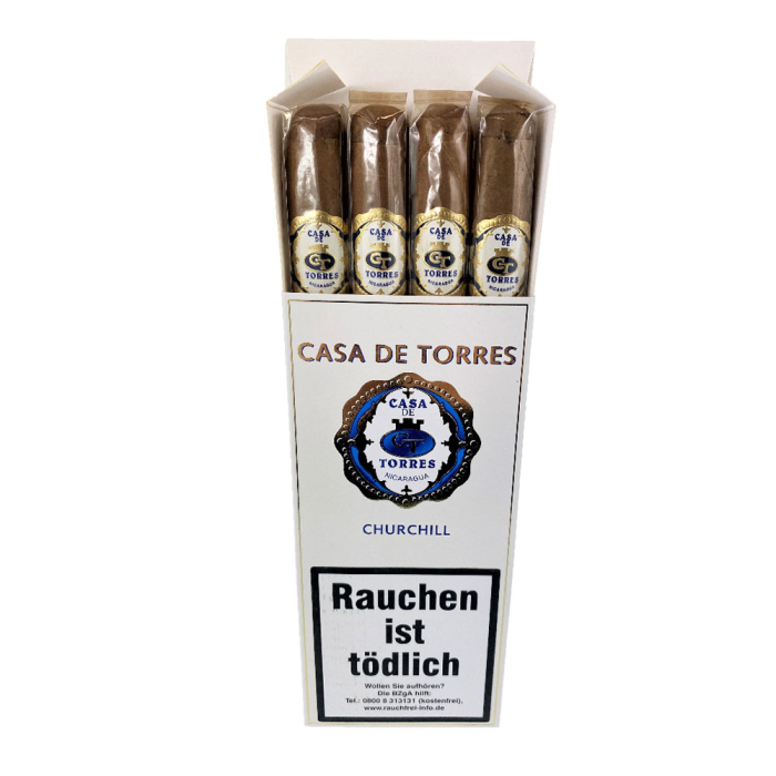 Casa de Torres Churchill — это сигары ручной работы, произведённые в Никарагуа из высококачественного местного табака. Формат Churchill обеспечивает длительное и ровное курение с постепенным раскрытием вкуса. В ароматическом профиле доминируют мягкие древесные, ореховые и сливочные ноты. Светлый покровный лист из Эквадора придаёт вкусу деликатность и утончённость.