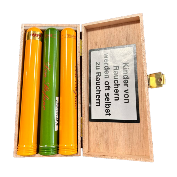 Упаковка: деревянная коробка, 3 сигары в тубусах