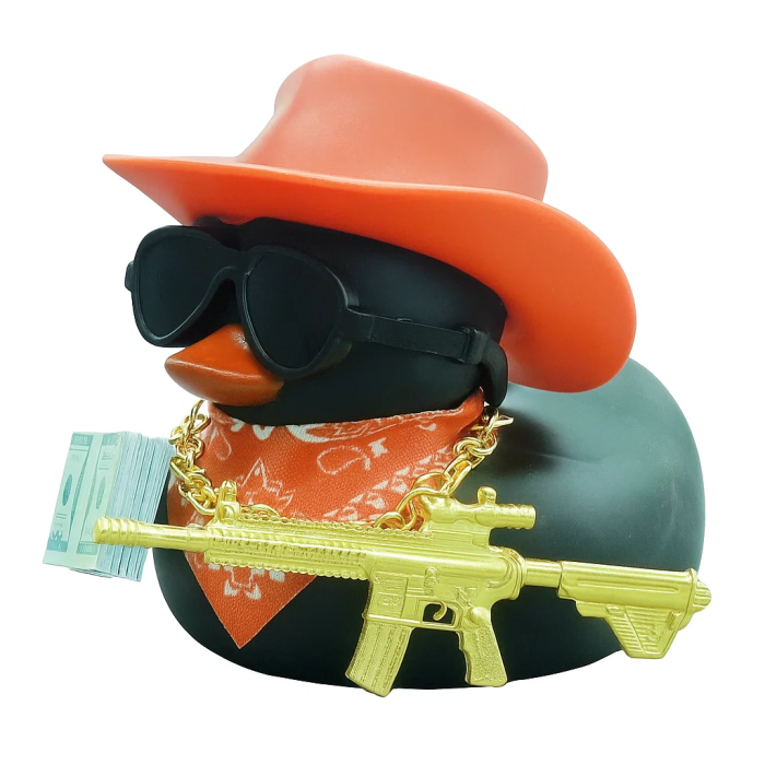 Стильне чорне каченя у ковбойському капелюсі з сонцезахисними окулярами, золотим ланцюгом і мініатюрною гвинтівкою виглядає по-справжньому ефектно та креативно. Такий талісман одразу привертає увагу і дарує атмосферу пригод.