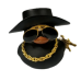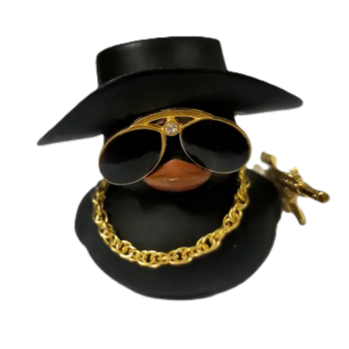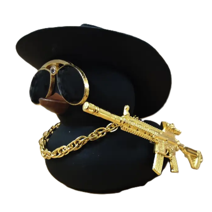 Ефектне чорне каченя у стильному капелюсі з сонцезахисними окулярами, золотим ланцюгом та мініатюрною гвинтівкою виглядає по-справжньому брутально й креативно. Такий талісман миттєво привертає увагу та додає інтер’єру авто індивідуальності.
