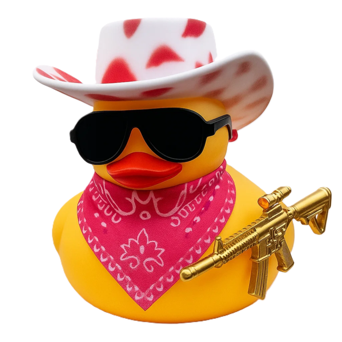 Cool Duck Жовте каченя в біло рожевому капелюсі з гвинтівкою — там, де задоволення починається з вибору