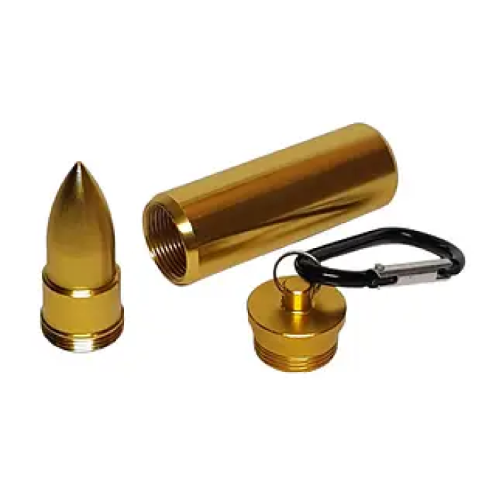 Брелок виготовлений із легкого, але міцного металу, що гарантує його довговічність і захист вмісту. Завдяки герметичній різьбі всередині можна безпечно зберігати невеликі предмети — таблетки, дрібні гроші, записки або ароматизатори. Компактний розмір дозволяє легко носити аксесуар із собою щодня.