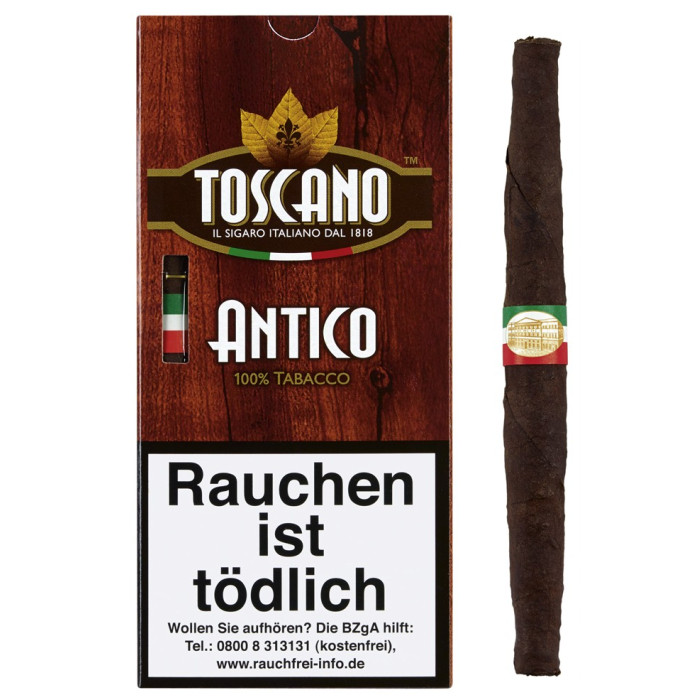 Toscano Antico — це сигари ручної скрутки, виготовлені в Італії з ферментованого тосканського (San Lucio) тютюну. Відзначаються насиченим, трохи гострим смаком з землистими, деревними нотами. Підходять для поціновувачів яскравих італійських сигар, готові до куріння відразу після відкриття упаковки.