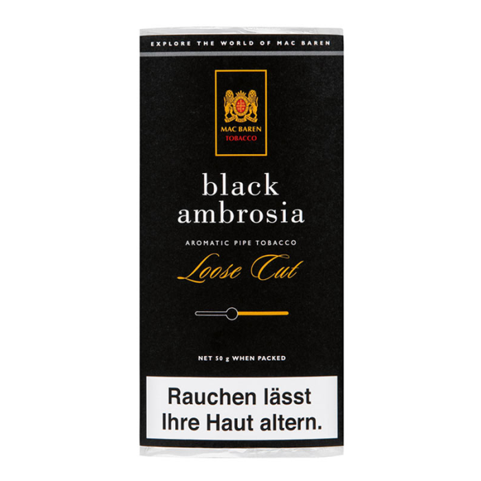 Mac Baren Black Ambrosia — це ароматизований тютюн для люльки від датського виробника Mac Baren. Суміш створена на основі класичних сортів тютюну з додаванням ароматизованого чорного Кавендіша, що надає їй солодкого та м’якого смакового профілю.