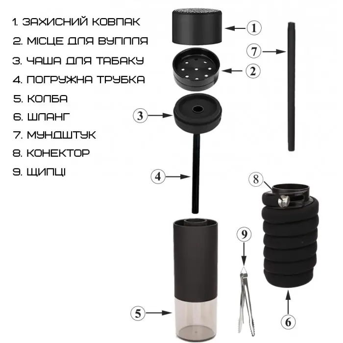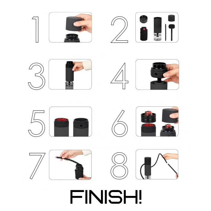 Перед першим використанням промити всі елементи кальяну. Для кращого результату використовувати якісне вугілля та не перевищувати рекомендований рівень води.