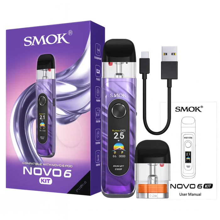 Pod система Smok Novo 6 — це оновлена модель у популярній лінійці Novo, яка вирізняється найбільшим акумулятором серед компактних подів SMOK та великим повнокольоровим дисплеєм.